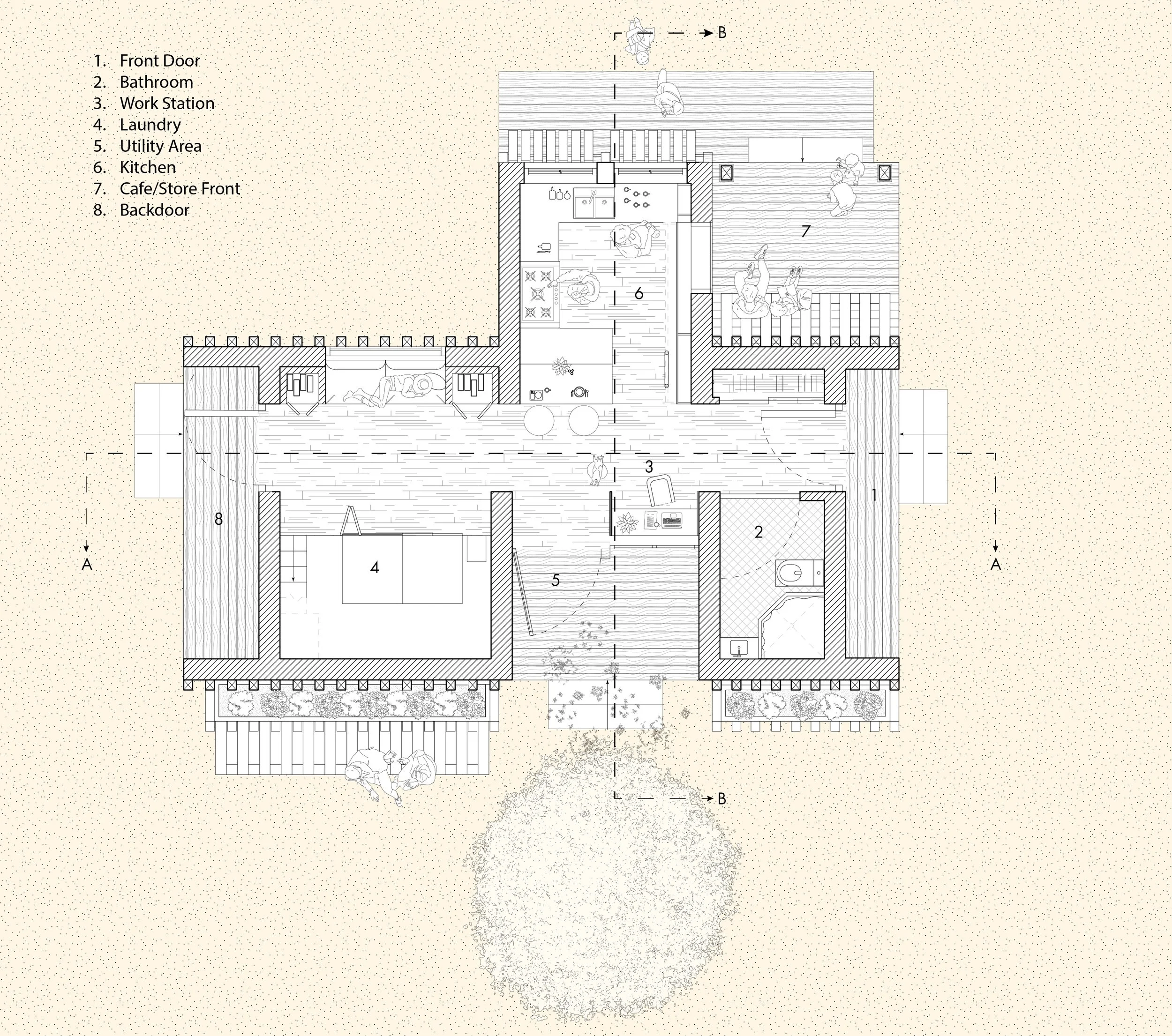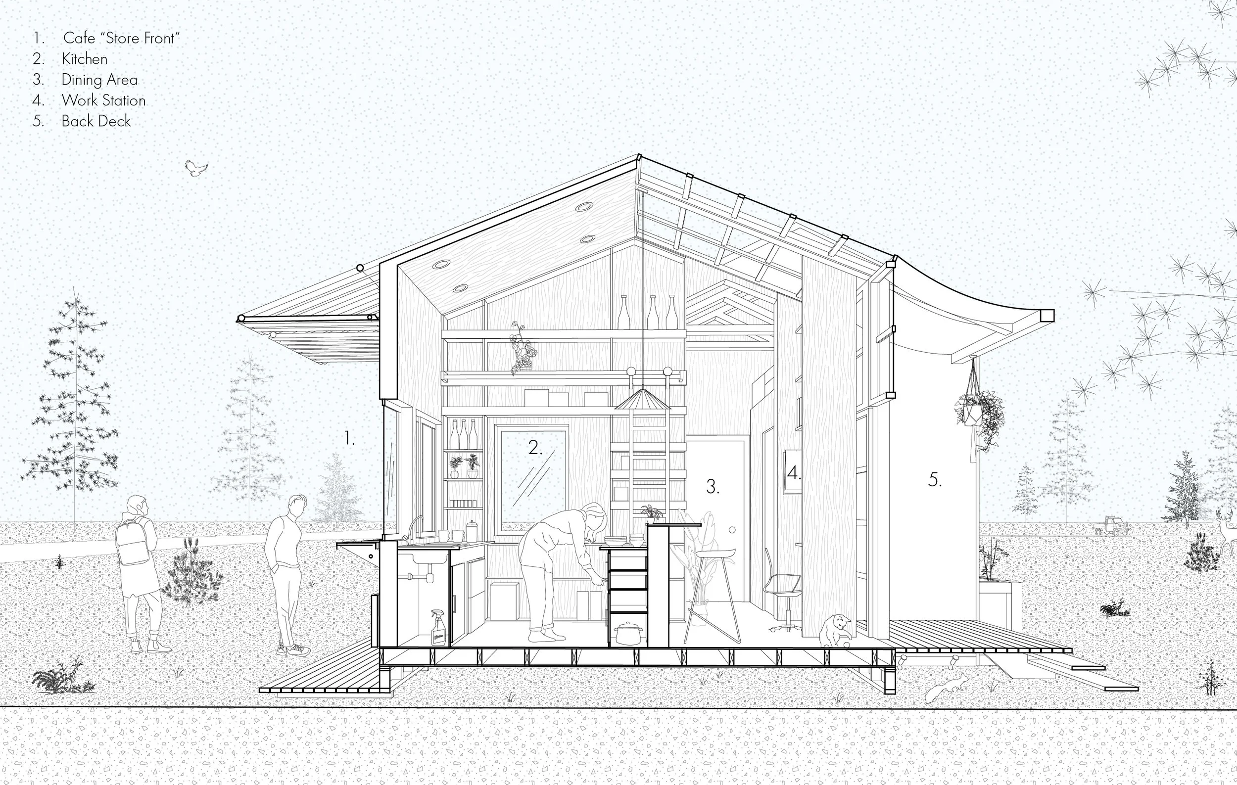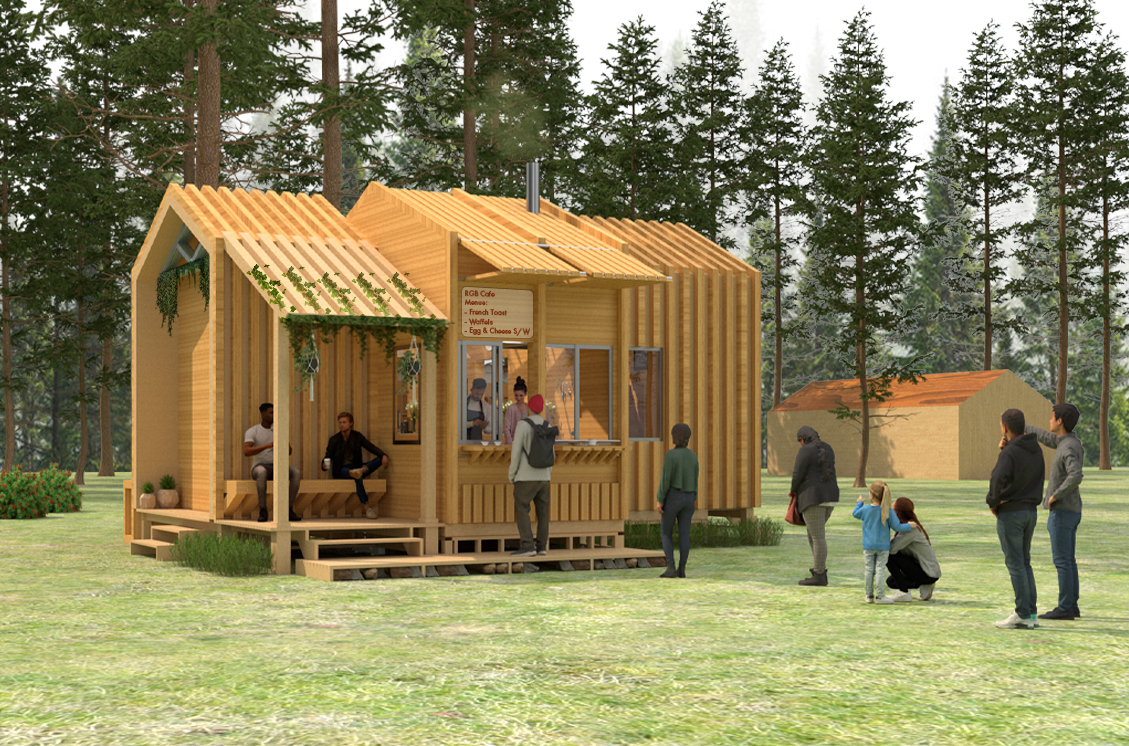 Canyon Cottage was an independent, collaborative project for the 2023 Tiny House competition presented by Volume Zero. The house is set in Canyon Dam, CA, which was left in ruins due to the 2021 Dixie Fire. This project recognises the fire’s economic impact and proposes a solution towards rebuilding by accommodating both commercial and private residential spaces within a tiny home. The unit comprises three “bays” offering two private spaces and a semi-commercial-use central zone. This layout allows residents to adapt their living spaces to their needs and potentially pursue entrepreneurial ventures like a coffee stand. The face of the commercial zone is equipped with a movable screen that allows for a service area when opened and privacy when closed. The design also promotes prefabricated CLT construction and a Ground Frame Saddle Foundation system. This allows for lower costs as well as easier assembly and relocation. Its modularity also allows for future expansion and adaptation as the town slowly gets back on its feet.