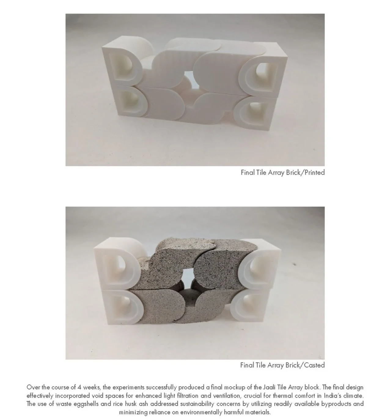 India’s construction industry faces a growing challenge: its reliance on carbon-intensive materials and practices contributes significantly to its carbon emissions, exacerbated by inadequate waste management infrastructure. Exploring alternative materials is crucial to mitigating this environmental impact. This paper examines the innovative use of biodegradable eggshell bricks in constructing jaali walls. Jaali walls, traditionally crafted from intricately carved stone or wood, are renowned for their aesthetic appeal and ability to provide natural ventilation and light filtration through perforations. This research investigates the feasibility of utilizing eggshell waste, a readily available and sustainable material, to create eco-friendly jaali wall systems. The study examines the manufacturing process of eggshell bricks, their structural properties, and their suitability for creating complex jaali patterns. The environmental benefits of using eggshell bricks, such as waste reduction and reduced reliance on conventional building materials, are discussed. The findings of this research contribute to the development of sustainable building practices and offer a novel approach to traditional jaali wall construction.