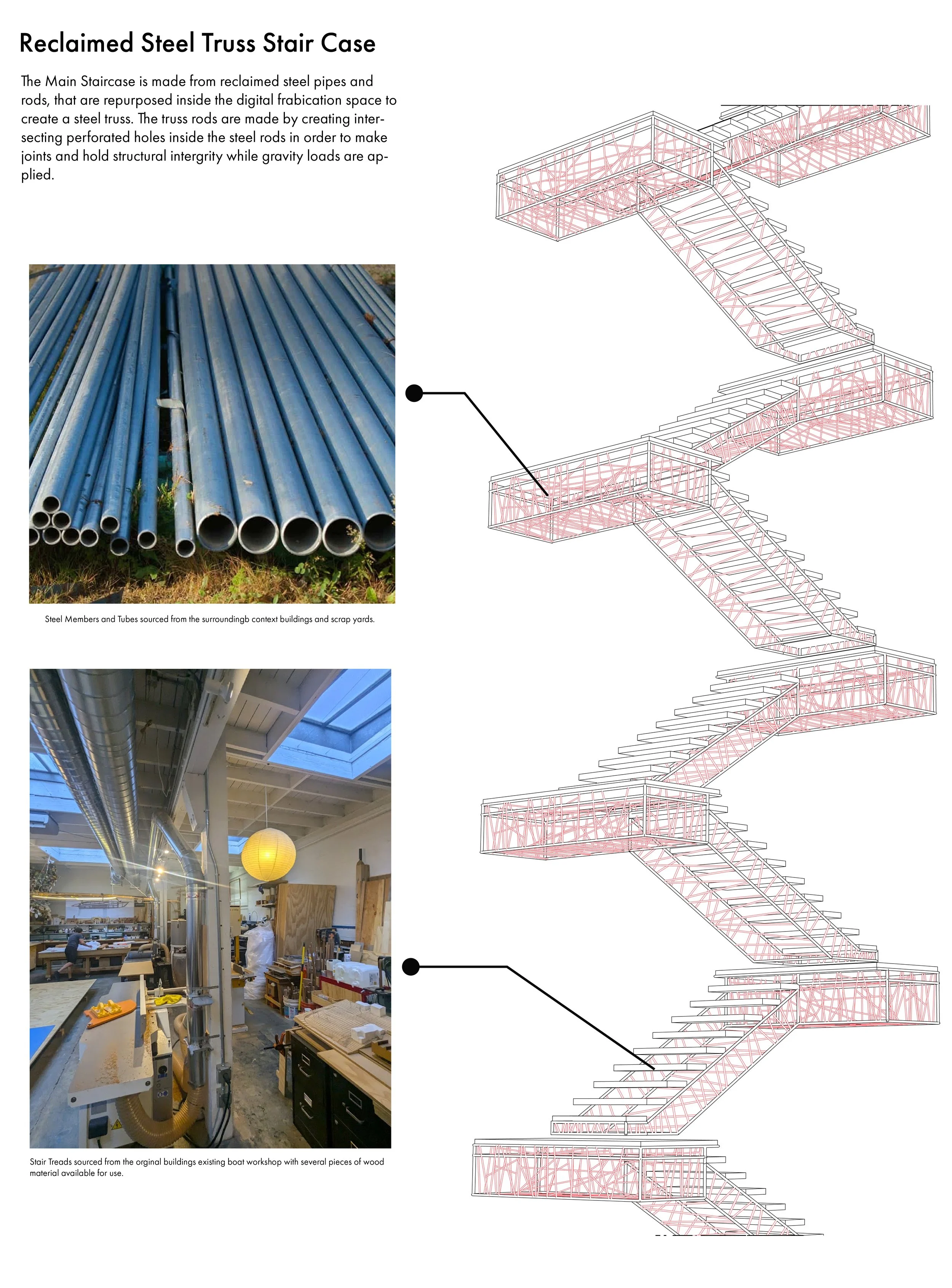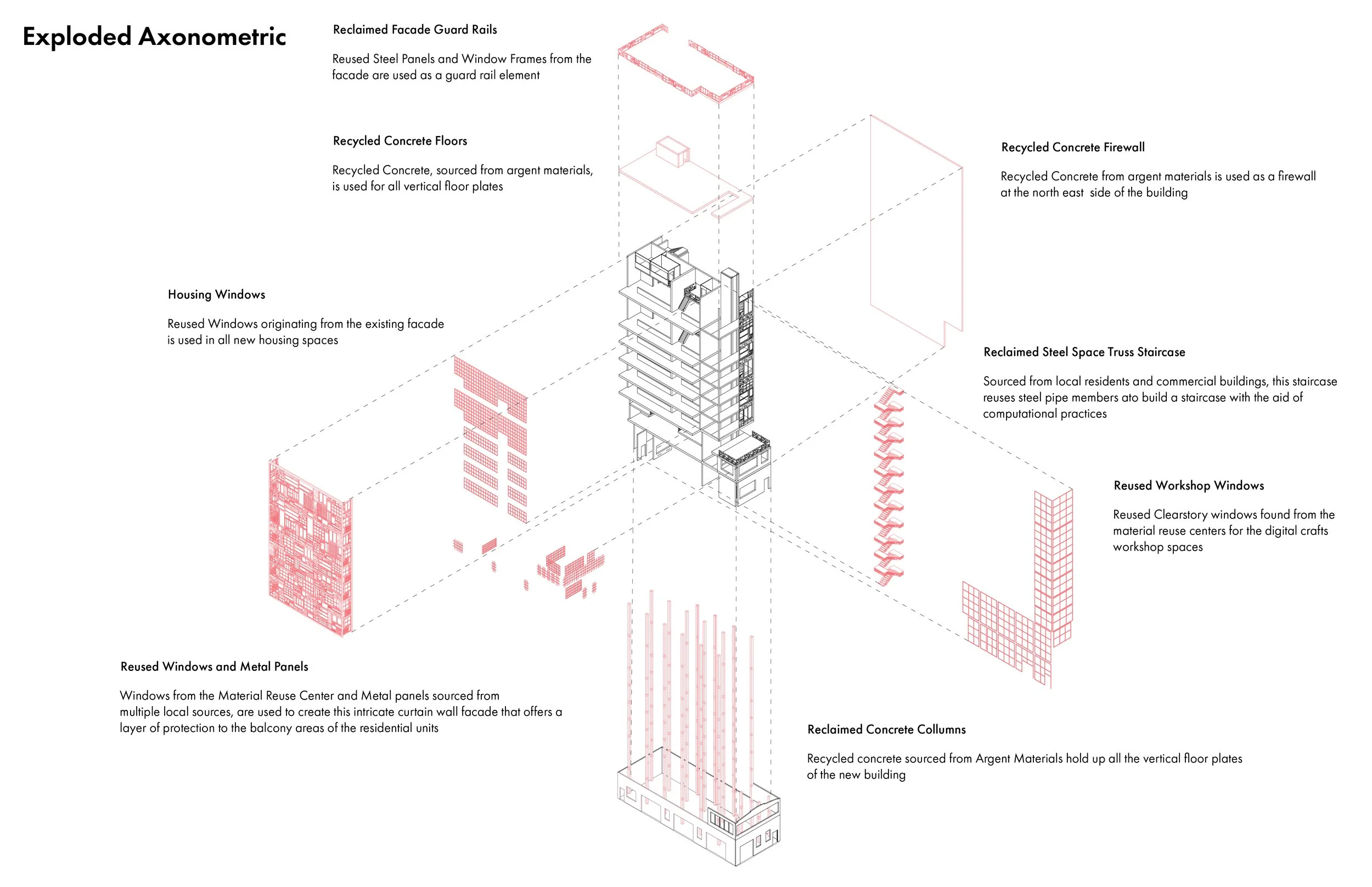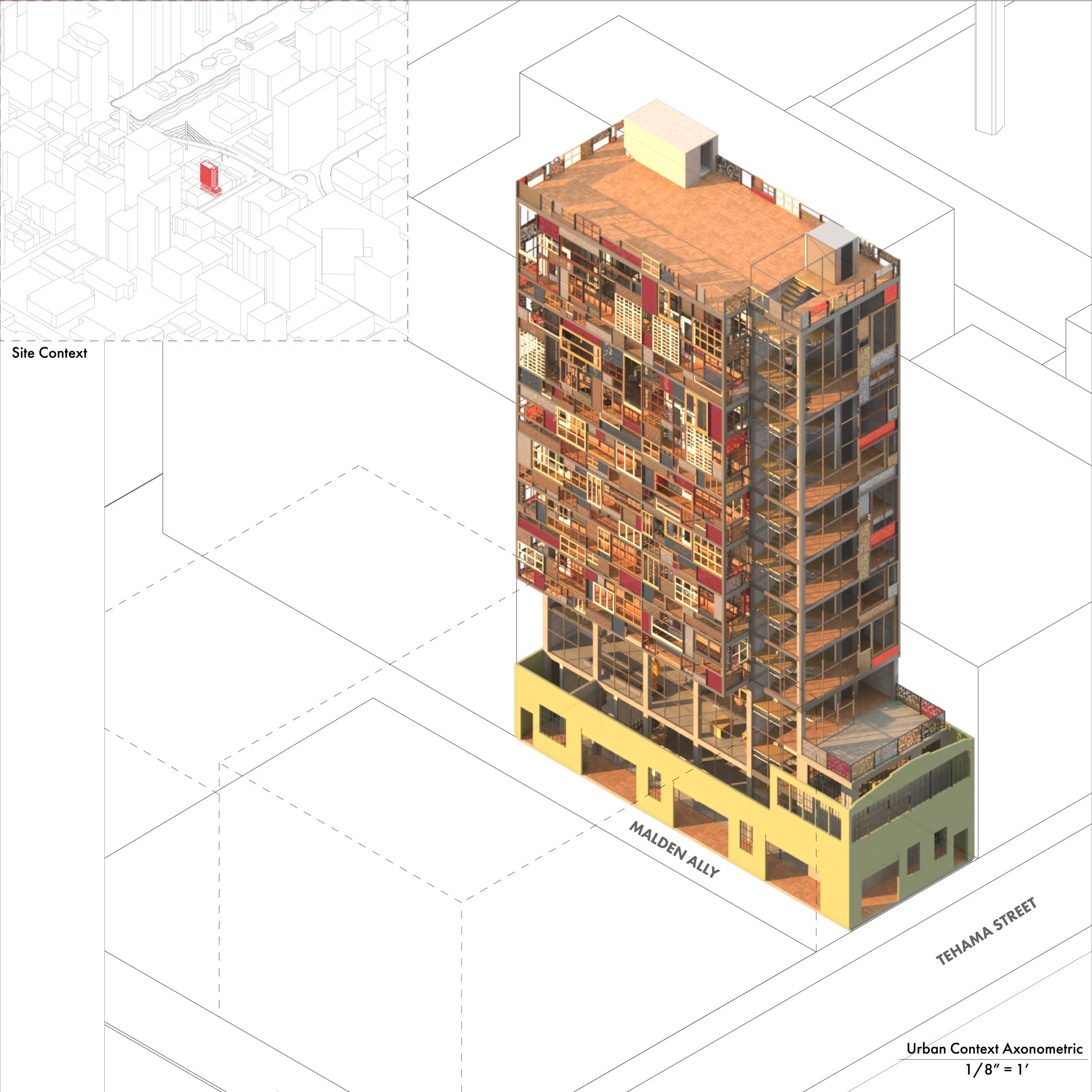 Set near the bustling area of San Francisco’s financial district, Offset Alley is a 10-story tall mixed-use residential space that takes advantage of the site's existing structure and enhances it to suit the needs of the actively used digital crafts workshops. Keeping the existing building in mind, the original walls are maintained to create a sense of continuity rather than creating a new structure. At the same time, the interior elements are removed to make room for new programs. The west and south walls of the building are set back by six feet at ground level to allow natural light to enter the fabrication rooms. The first two floors house the main digital fabrication areas, which include a laser lab and a robotics workshop. Several key elements from the original building, such as windows, doors, and garage doors, have been preserved to reduce costs and maximize available resources. The top five floors are dedicated to residential units, with access primarily provided by a steel truss staircase. This staircase was crafted in the digital fabrication lab, serving as a functional and aesthetic element of the building. Additionally, reclaimed steel panels have been perforated and incorporated into the facade to provide sun shading and enhance the exterior's visual appeal.