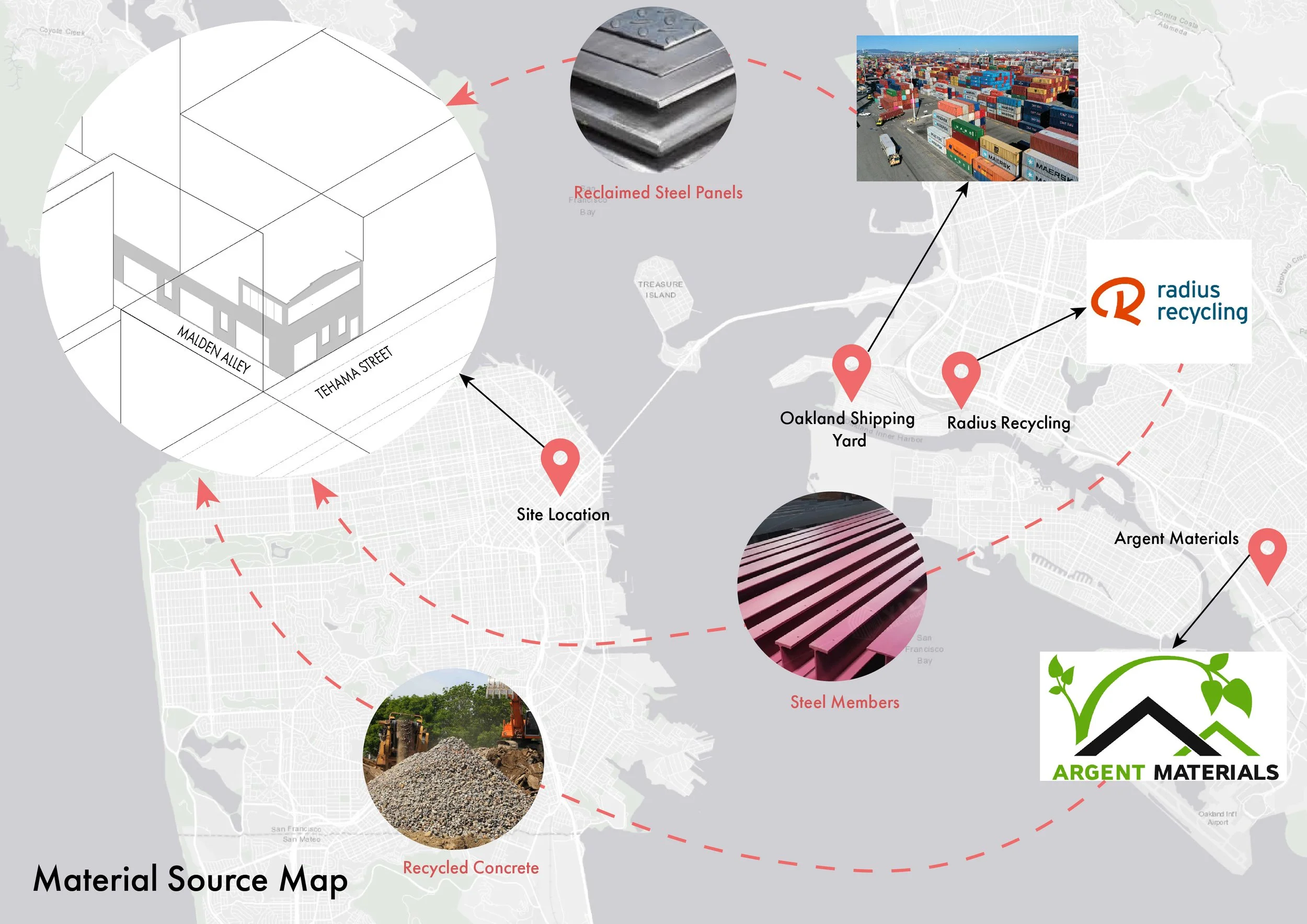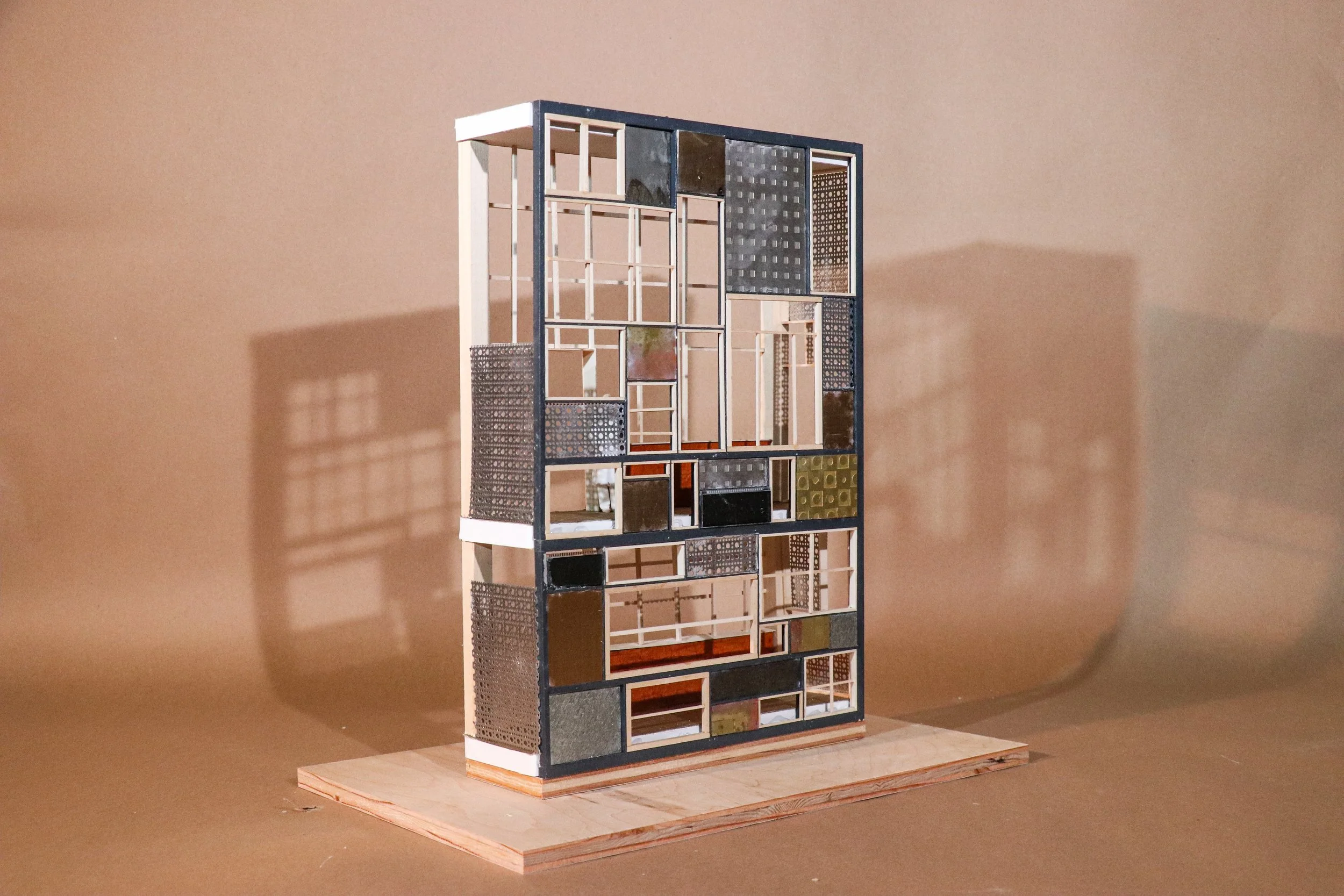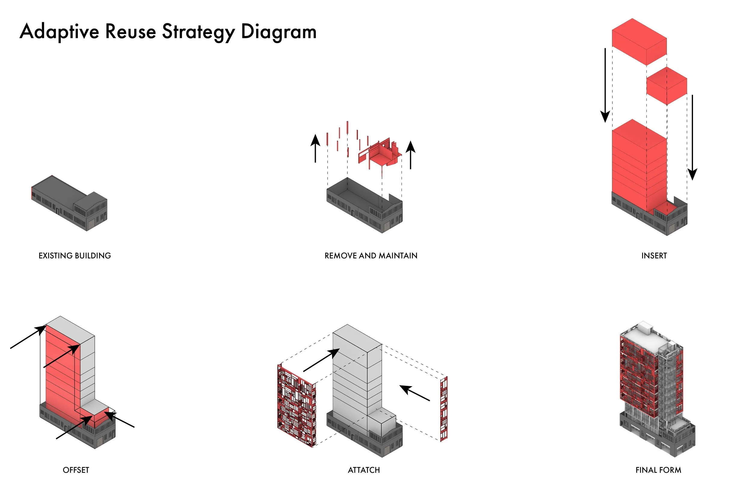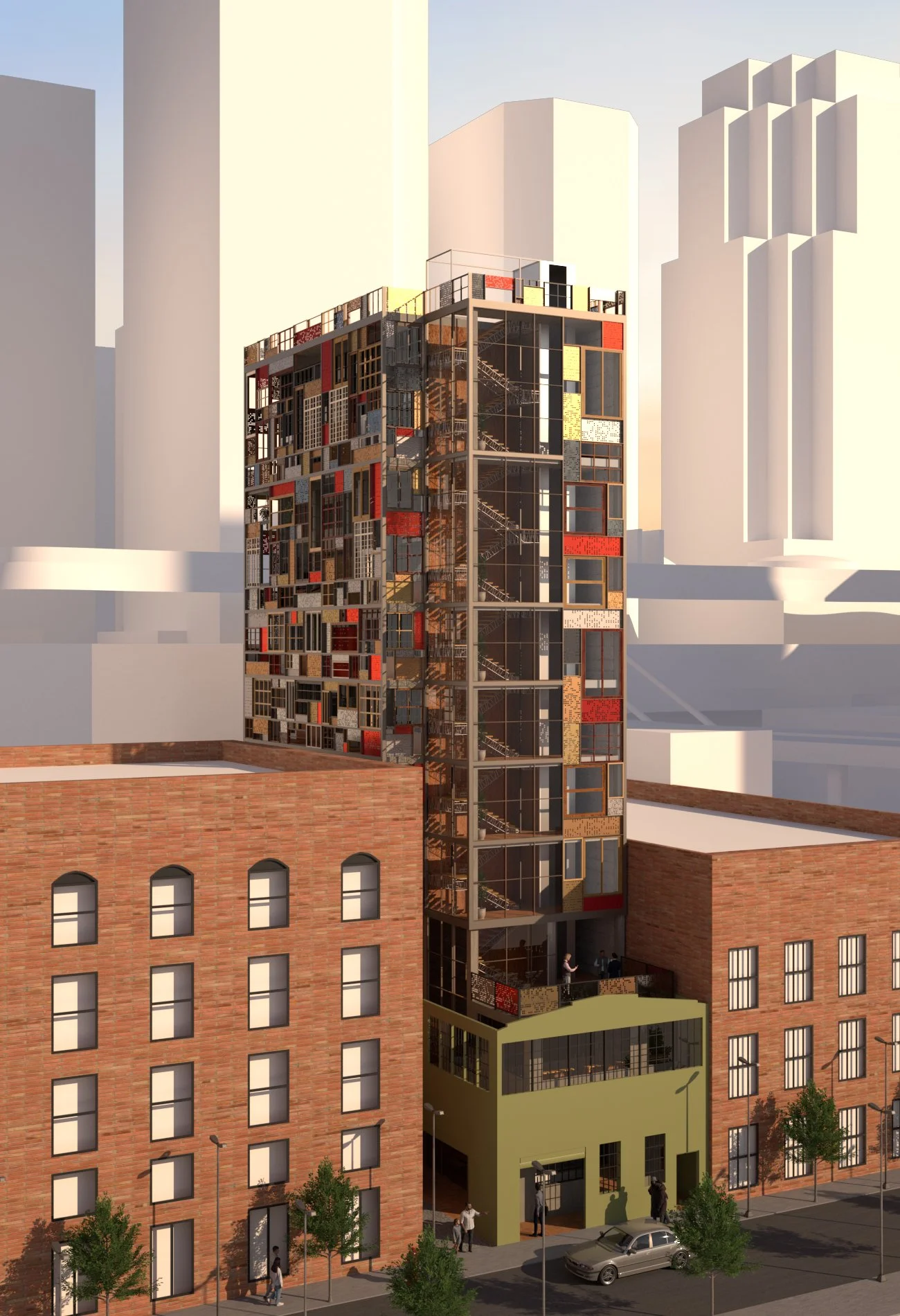 Set near the bustling area of San Francisco’s financial district, Offset Alley is a 10-story tall mixed-use residential space that takes advantage of the site's existing structure and enhances it to suit the needs of the actively used digital crafts workshops. Keeping the existing building in mind, the original walls are maintained to create a sense of continuity rather than creating a new structure. At the same time, the interior elements are removed to make room for new programs. The west and south walls of the building are set back by six feet at ground level to allow natural light to enter the fabrication rooms. The first two floors house the main digital fabrication areas, which include a laser lab and a robotics workshop. Several key elements from the original building, such as windows, doors, and garage doors, have been preserved to reduce costs and maximize available resources. The top five floors are dedicated to residential units, with access primarily provided by a steel truss staircase. This staircase was crafted in the digital fabrication lab, serving as a functional and aesthetic element of the building. Additionally, reclaimed steel panels have been perforated and incorporated into the facade to provide sun shading and enhance the exterior's visual appeal.