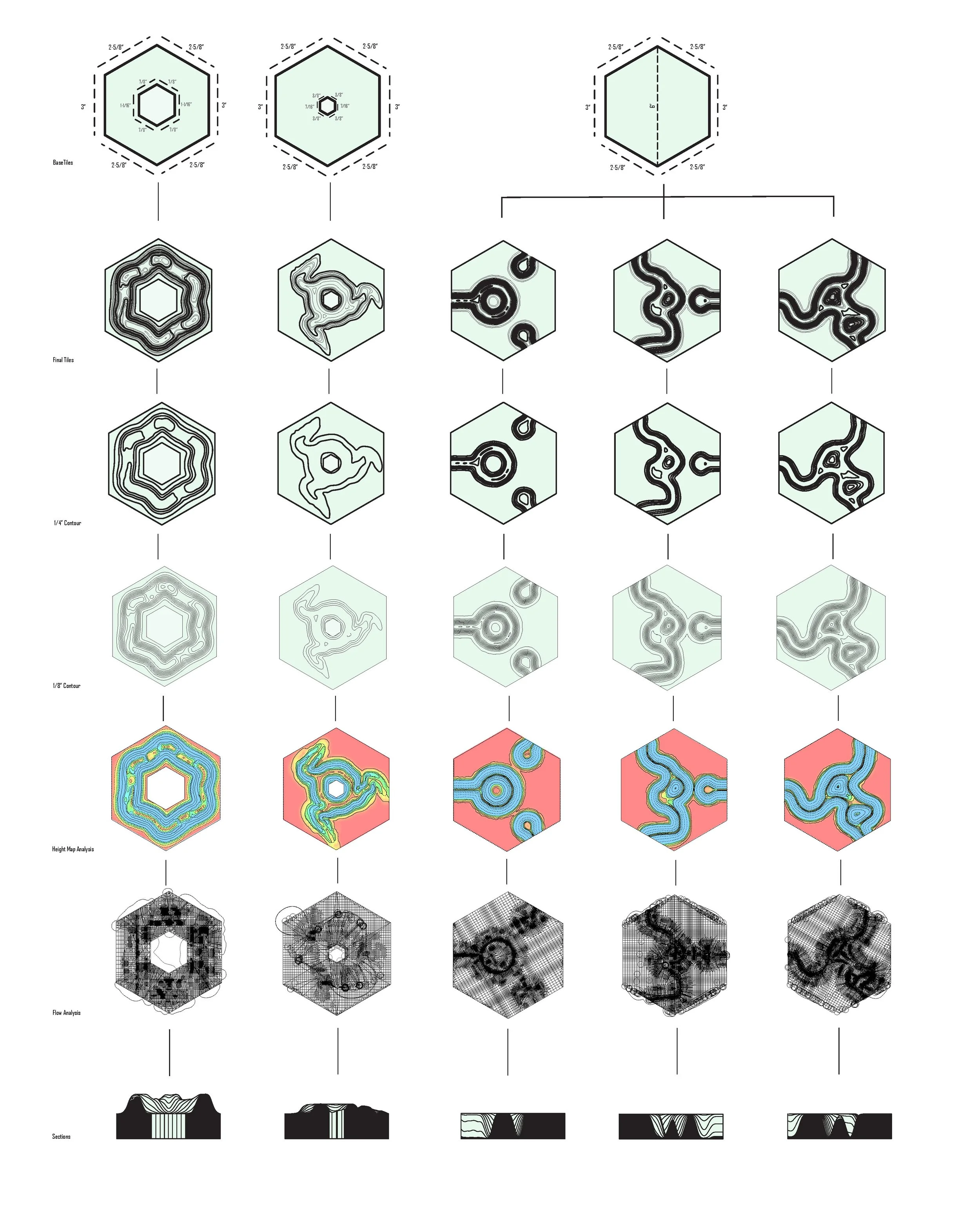 This group project delved into understanding the world of pathways and how objects navigate them. Five tiles were designed and arranged repeatedly to create a continuous path through which any fluid material, such as sand or water, can flow. In the initial design phase, we used Grasshopper and Rhino, which allowed us to experiment with different shapes and configurations, ensuring the path functioned flawlessly. The fabrication phase involved 3D printing to create positive moulds of each tile. The moulds were then used to create the negative moulds using plaster, and finally, the positives were made again using slip-casting techniques.