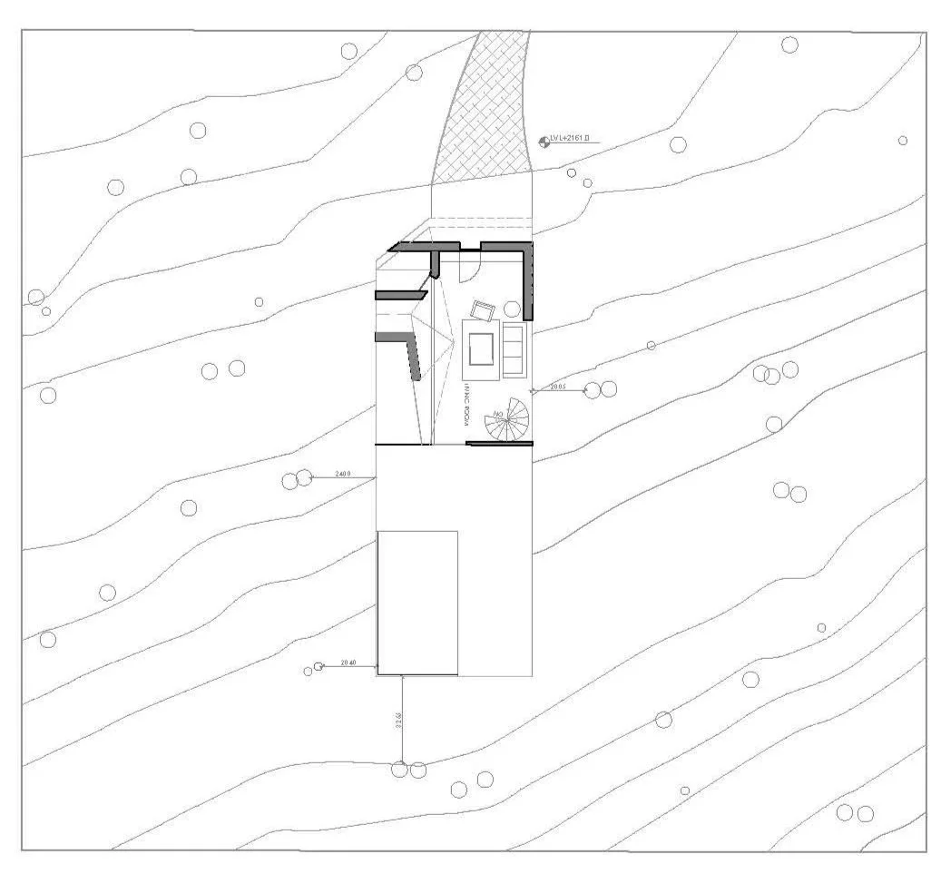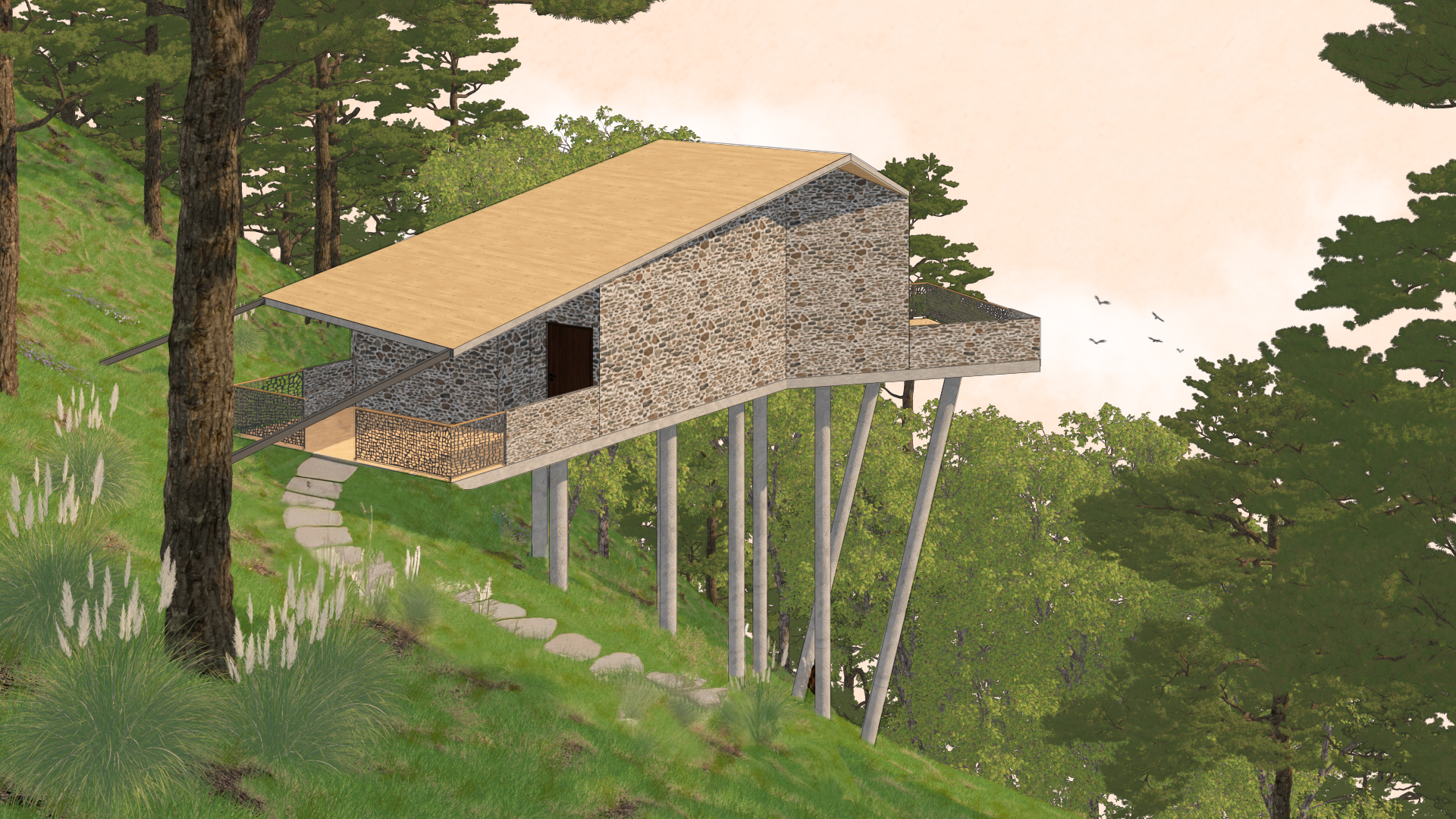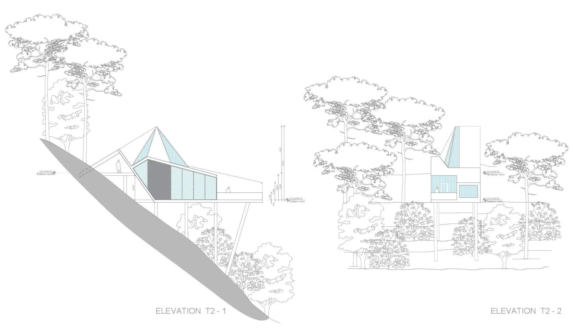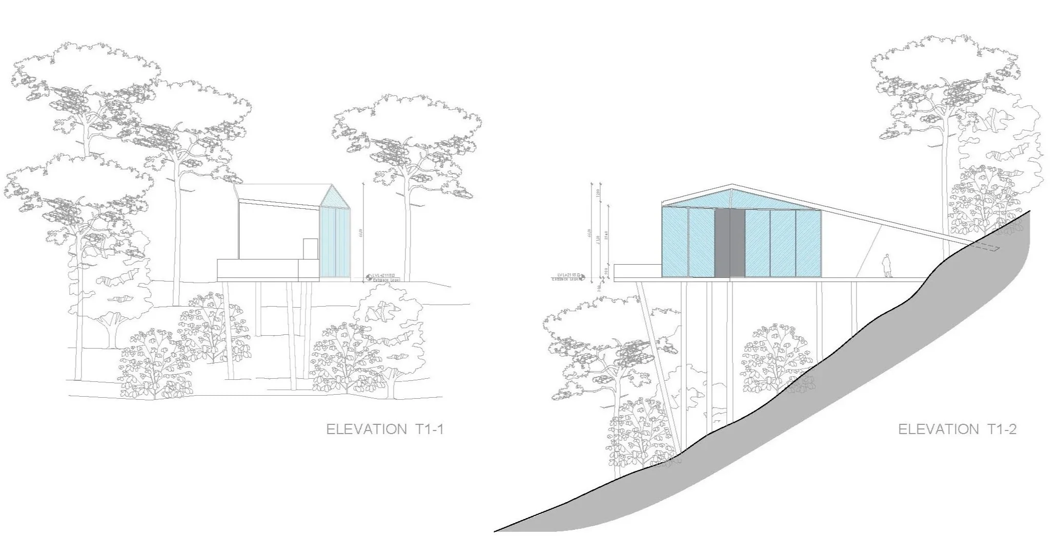 Defined by sharp, angular rooflines and expansive glazing, the elevations showcase a series of stilted volumes that perch lightly upon the steep slope, minimising ground contact while maximising the visual connection to the surrounding pine forest.
