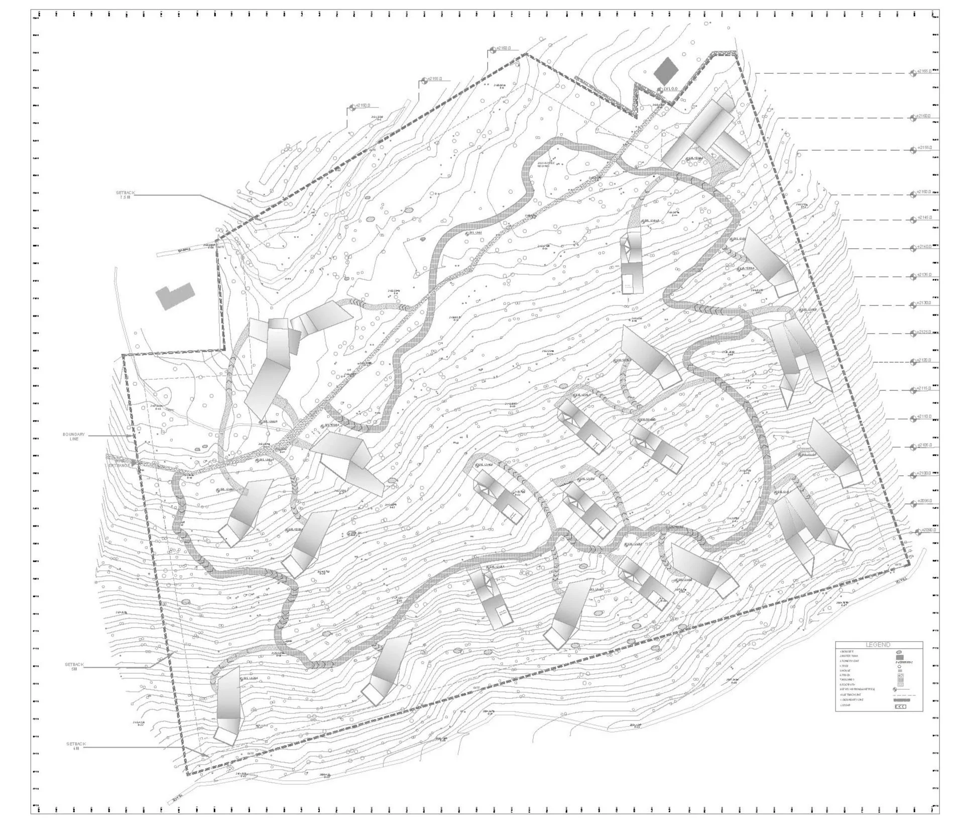 The master plan weaves a winding circulation spine that connects dispersed private cottages with communal gathering spaces, fostering a cohesive retreat experience.