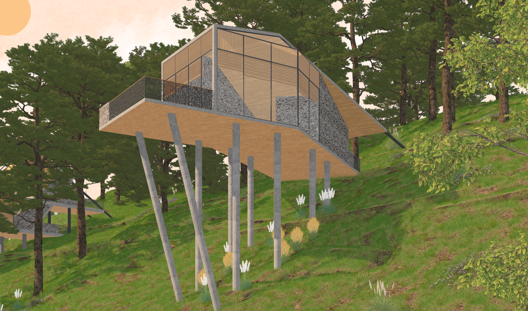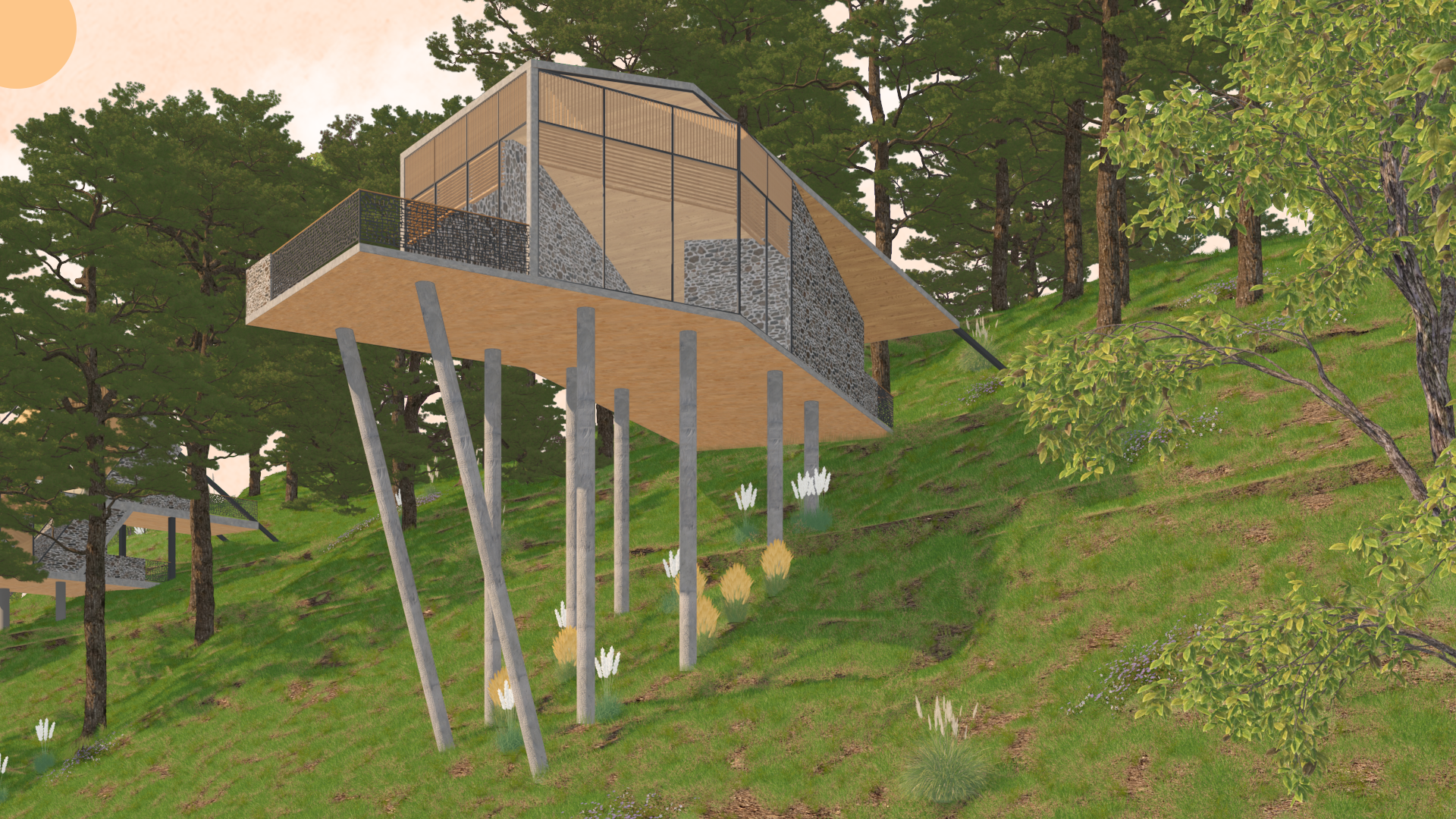 To mitigate the impact on the sensitive topography, the structures utilise a stilt foundation system, allowing the natural terrain and vegetation to flow uninterrupted beneath the built forms.