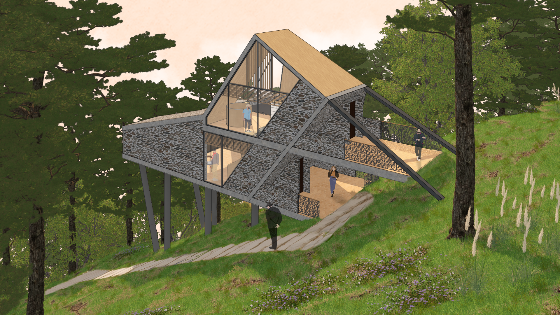 Visualised as rendered sketches, the imagery captures the ideological essence of the design, prioritising the architectural narrative and spatial form over photorealistic representation.